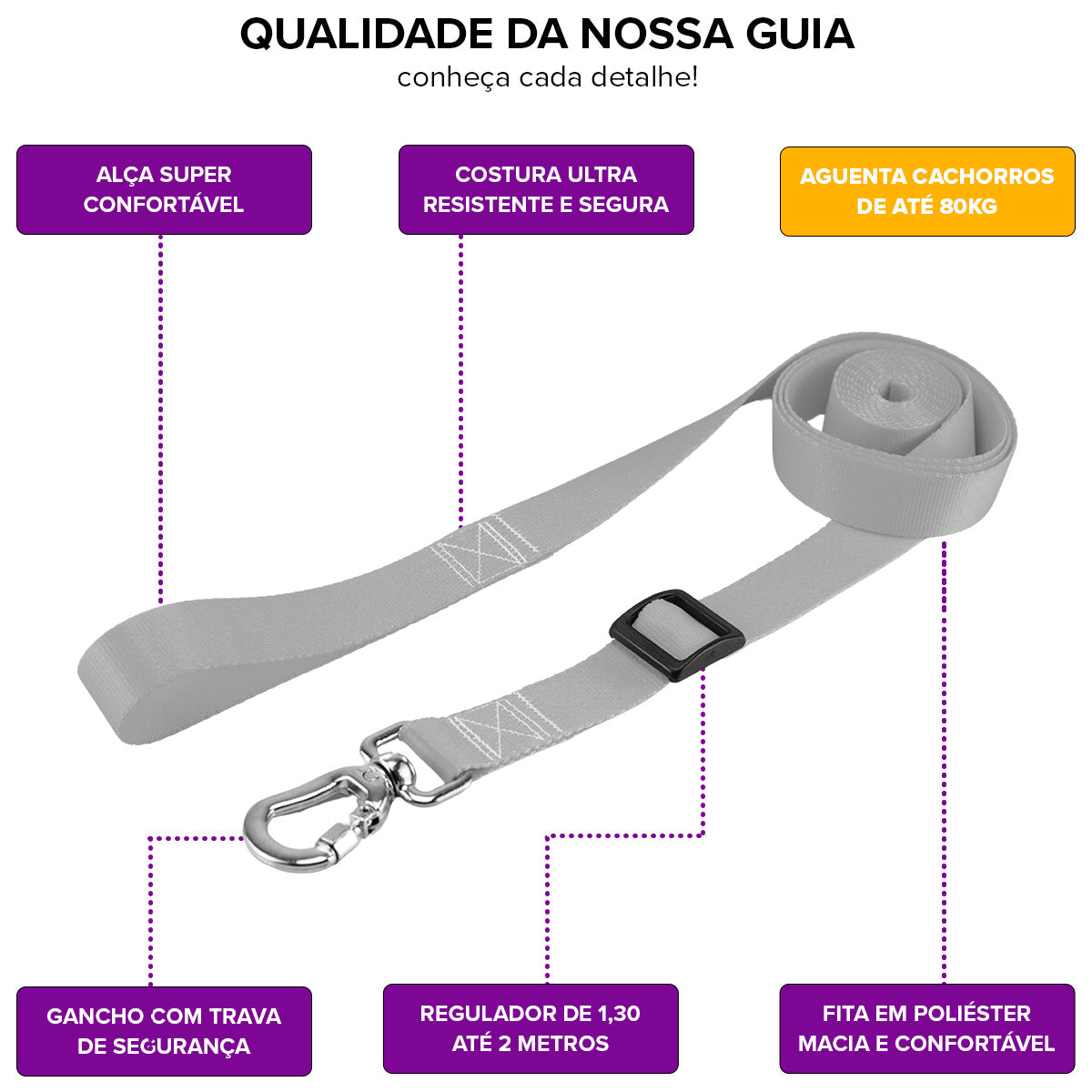 A Guia Regulável para cachorros é perfeita para o seu passeio, super macia e confortável para o seu pet e para você. Gancho resistente com rosca para travar e te dar mais segurança no passeio. Design exclusivo para a família toda ficar no estilo. Ela é regulável de 1,30 m até 2 m de comprimento, você escolhe o tamanho, regula e faz o seu passeio, você escolhe se quer o seu filho mais perto ou mais solto mas sempre no controle e com segurança.