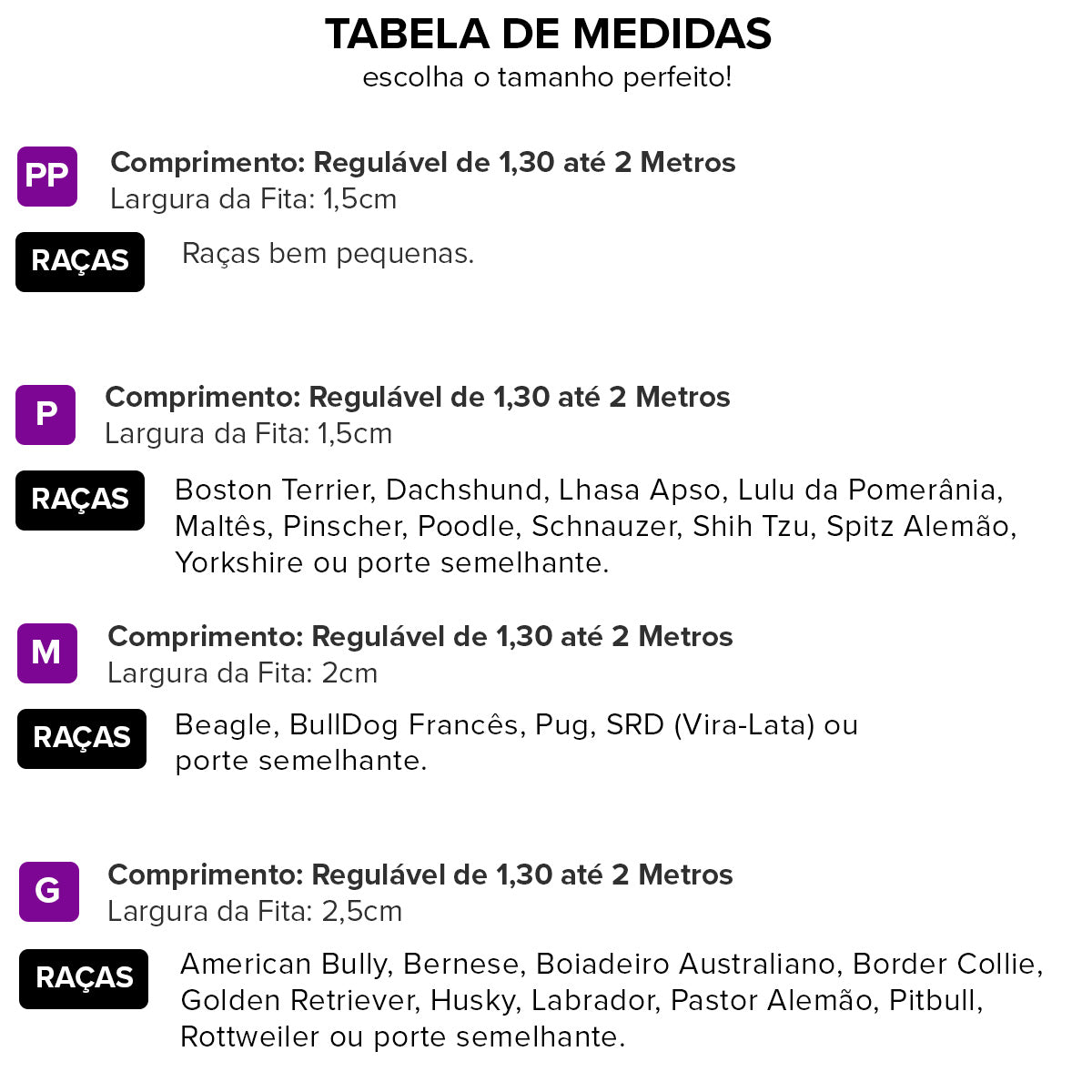 A Guia Regulável para cachorros é perfeita para o seu passeio, super macia e confortável para o seu pet e para você. Gancho resistente com rosca para travar e te dar mais segurança no passeio. Design exclusivo para a família toda ficar no estilo. Ela é regulável de 1,30 m até 2 m de comprimento, você escolhe o tamanho, regula e faz o seu passeio, você escolhe se quer o seu filho mais perto ou mais solto mas sempre no controle e com segurança.
