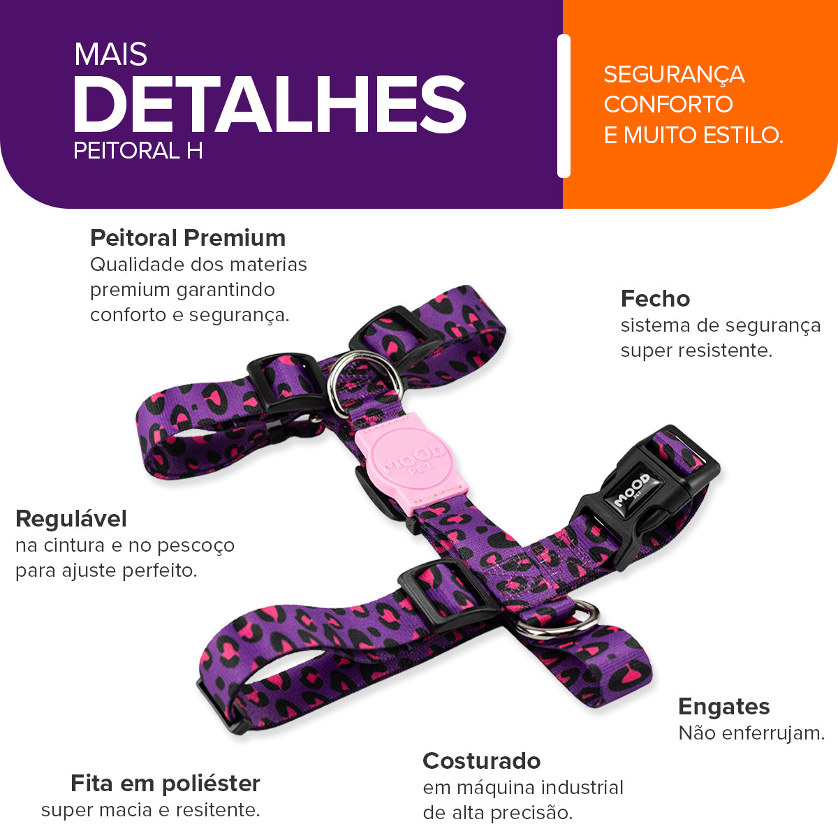O Peitoral H para cachorros é perfeito para o seu passeio, super macio e confortável para o seu pet. Fecho com sistema de segurança super resistente para te dar mais confiança no passeio. Design exclusivo para a família toda ficar no estilo. Esse é o peitoral queridinho de todos, ele tem regulagem na cintura e no pescoço para se adaptar perfeitamente no seu pet, possui dois pontos para prender a guia, um na altura do pescoço e outro na altura da cintura.